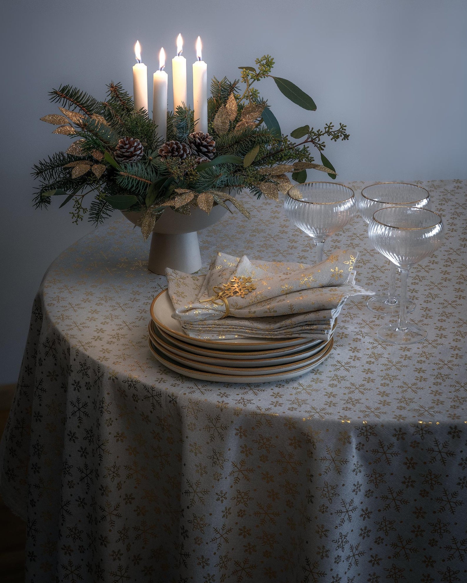 Napkins set of 4. BRIGHT CHRISTMAS, linen look with shiny golden snowflake print. Sewn from decorative 100% cotton.