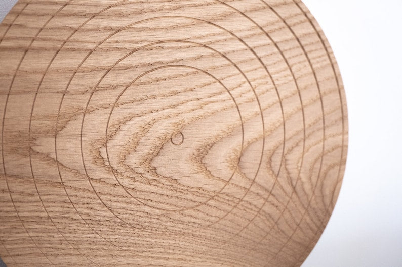 Show off your currently playing record with this original elegant natural oak wood display stand! Original vinyl record disk look.
