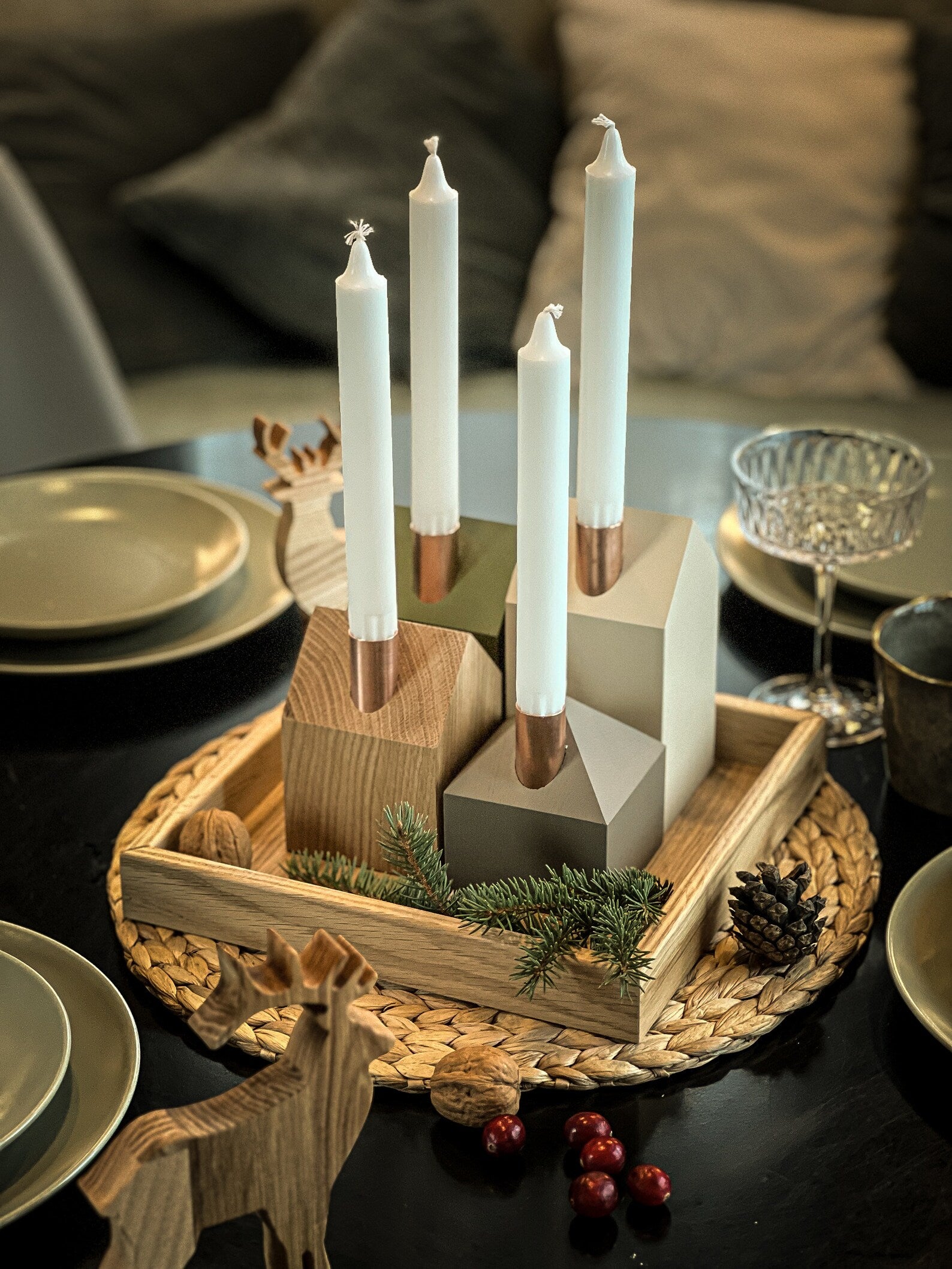 This is one of our best selling product types it is a set of 4 different height handmade wooden candle holders and a wooden tray.