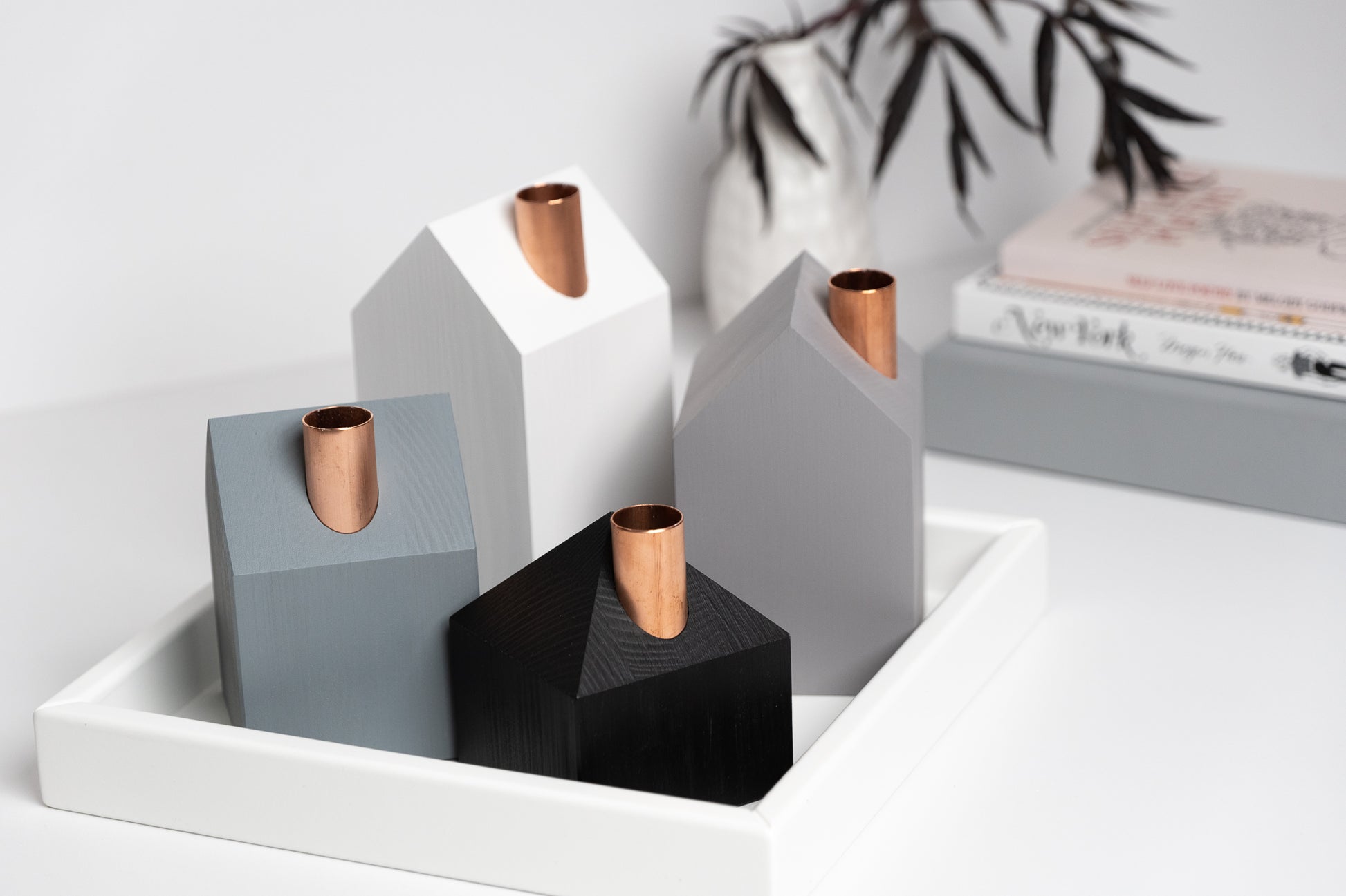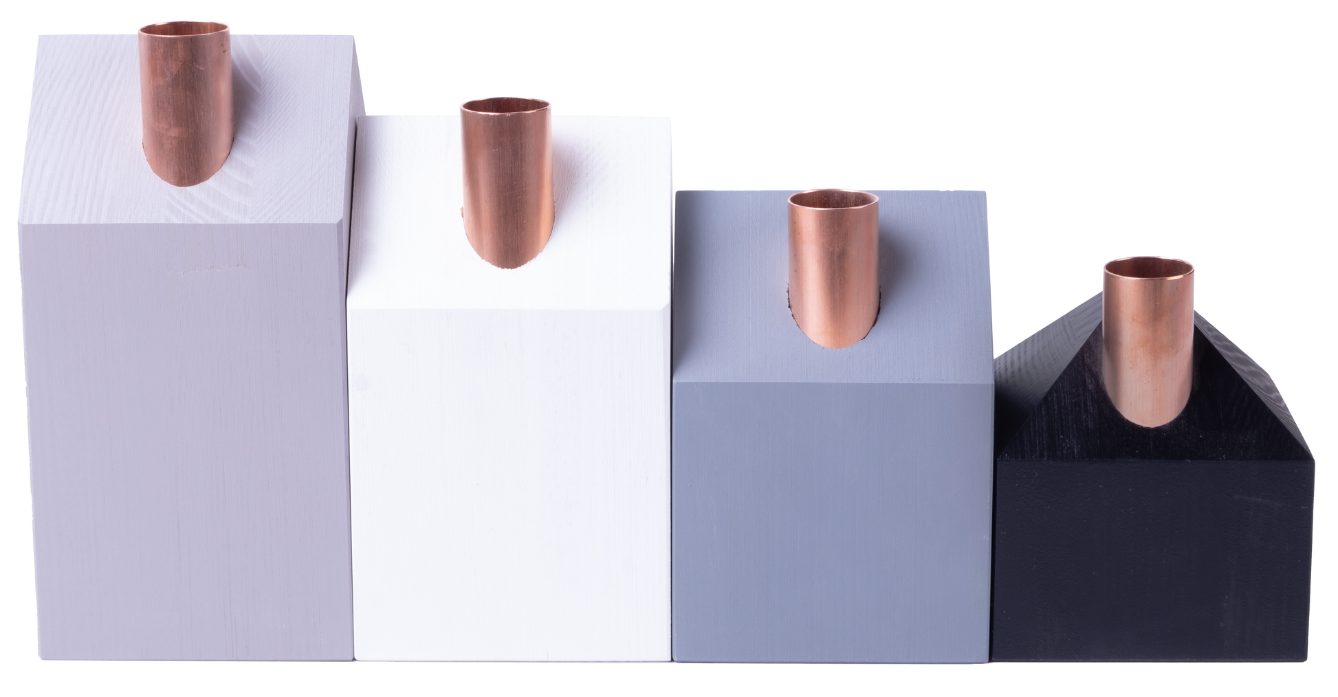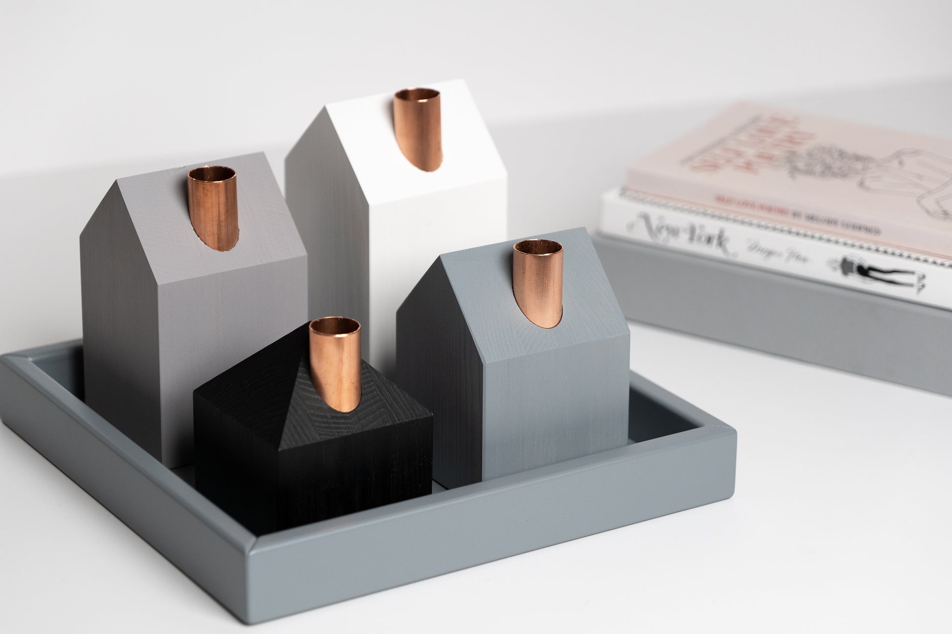 This is one of our best selling product types it is a set of 4 different height handmade wooden candle holders and a wooden tray.