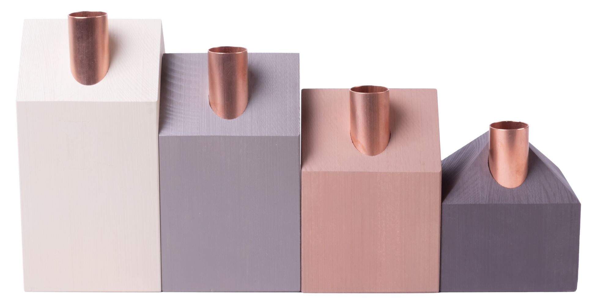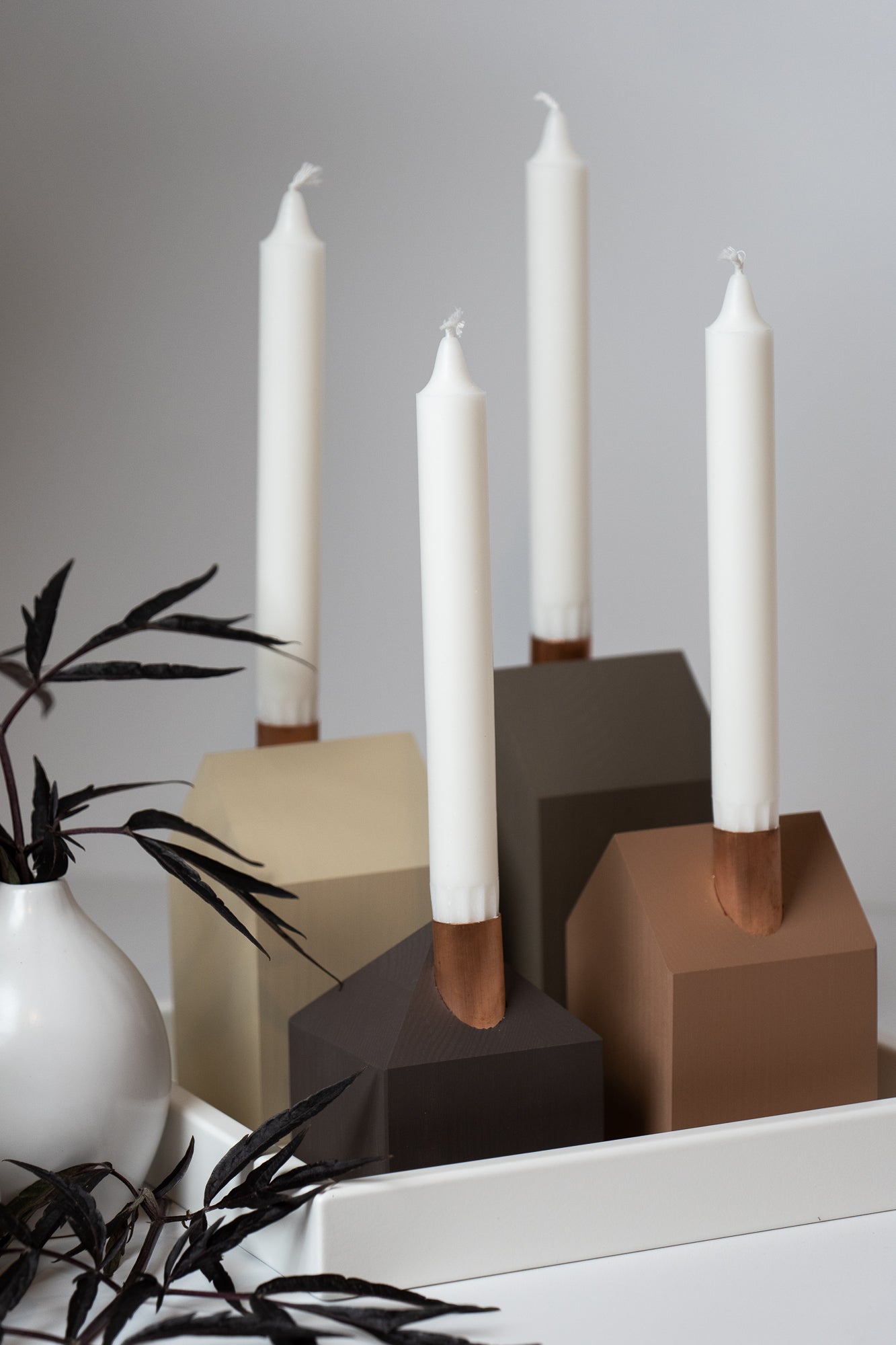 Each candle holder has a unique shape and natural grain or wood texture. Wood is a living material, and the grain direction and various imperfections are part of the essence and charm of wood. The candle holders are made from glued pine wood beams, and the color is applied in a single layer to preserve the natural appearance of the wood. Therefore, the glue joints are often visible on the product, which is not a defect but a characteristic of the material. Wood is constantly changing, which affects the color and structure of the product. Wood will continue to change throughout the life of the product. It is important to care for wooden products properly.