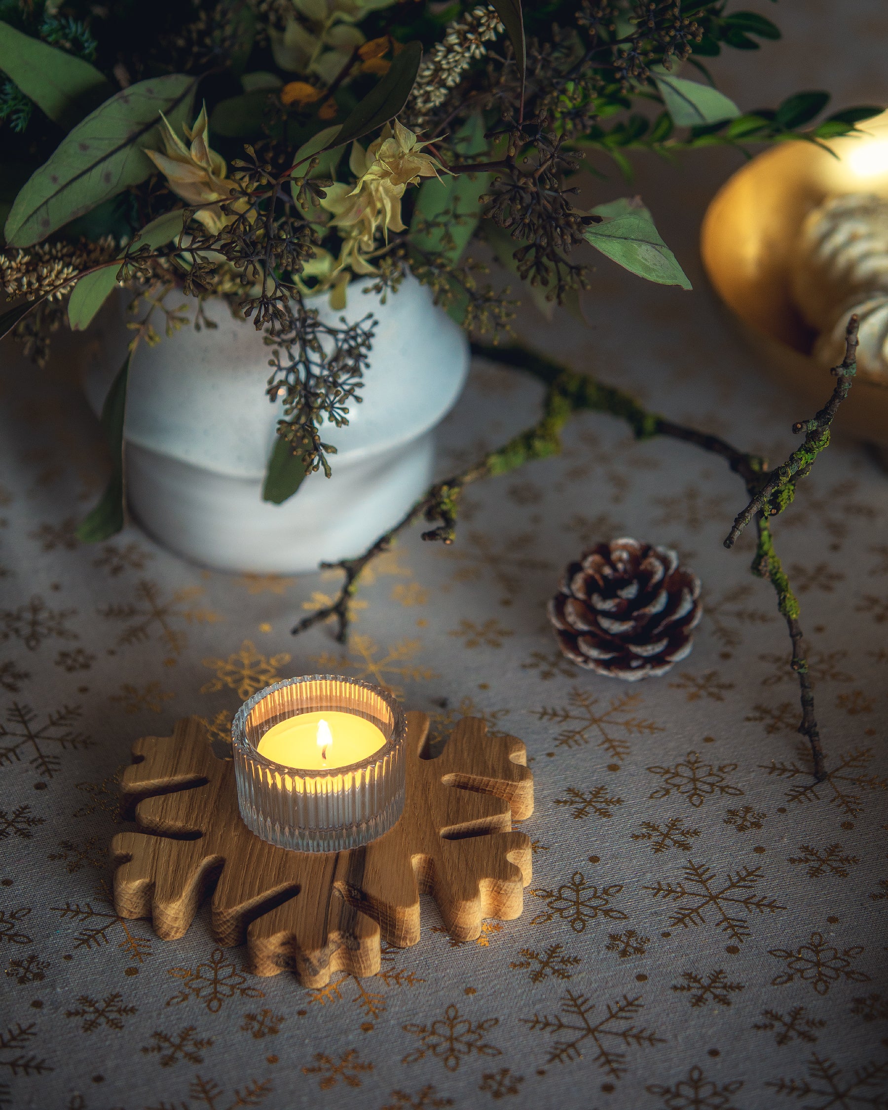 Tablecloth SHINING SNOWFLAKES, linnen look with shiny golden snowflake print. Sewn from decorative 100% cotton. in 3 sizes.