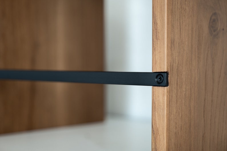 The black metal bar is both decorative and also serves as a fastener, so that relatively heavier objects can be placed on the shelf, for example a flower pot, a small radio, etc.